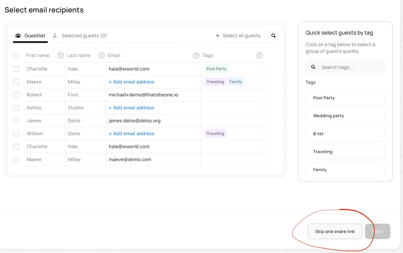 Select who you’d like to email digital invitations to—individually or by using tags for bulk selection. You can add missing email addresses directly in the table, with TTO highlighting any gaps for easy reference. Once selected, customize your email subject line and message—this is what guests will see in their inbox before opening your e-card.