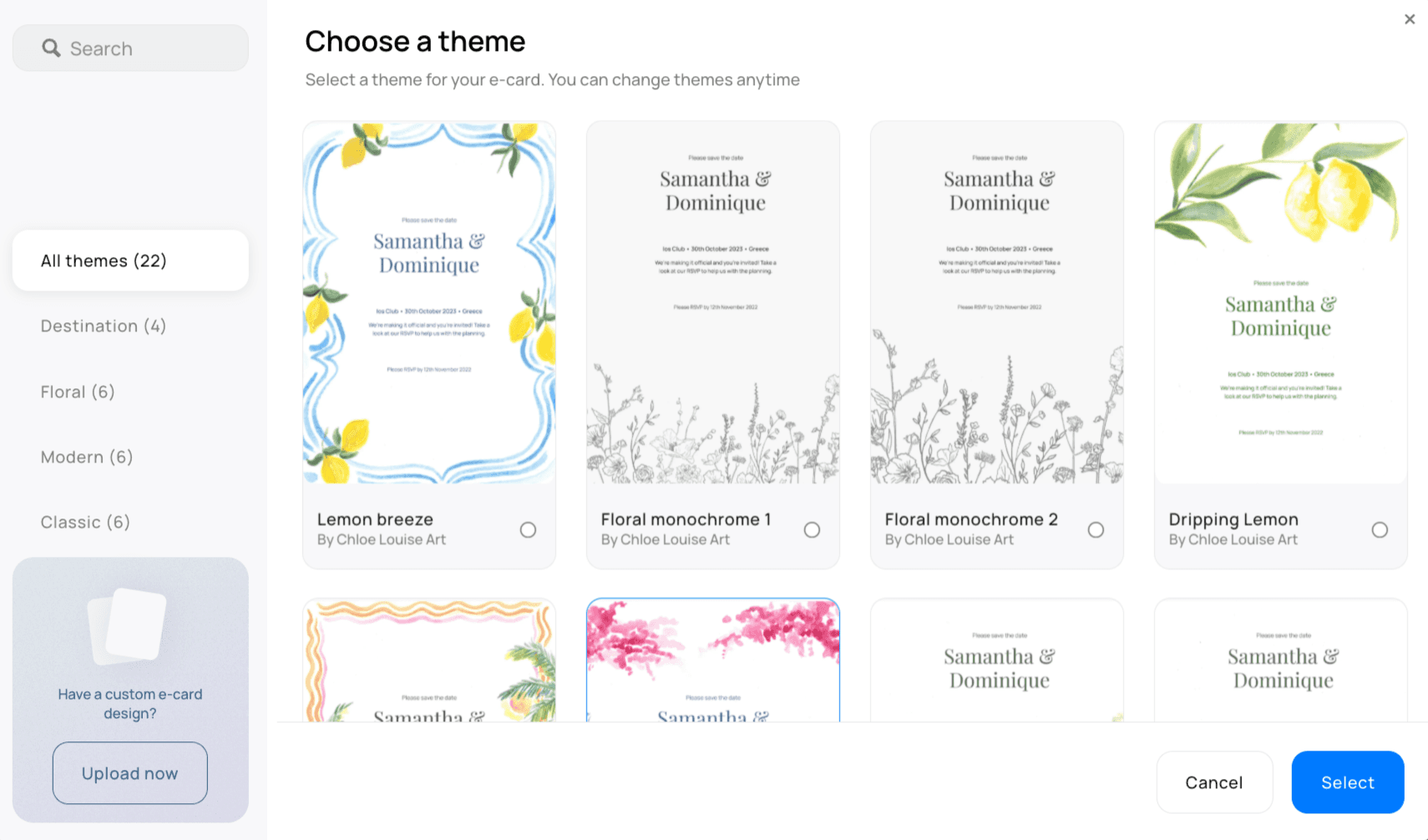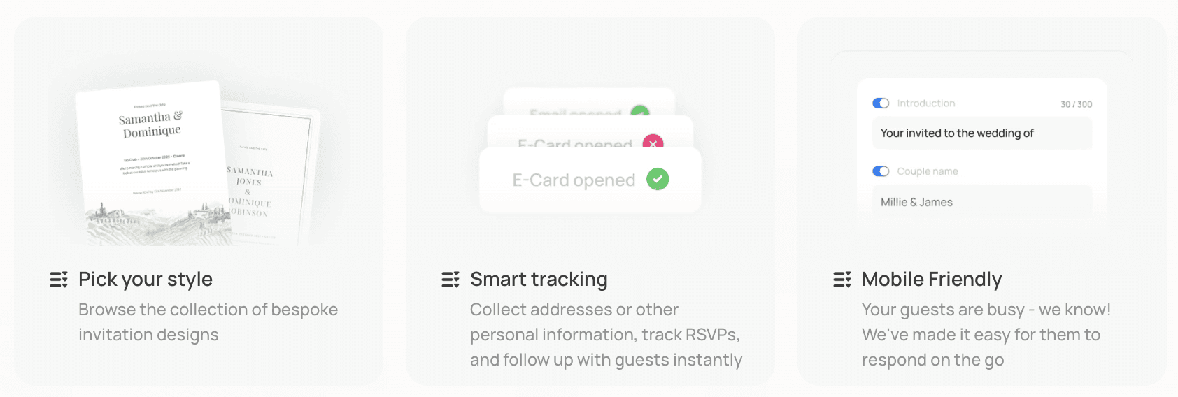 Note: The above are E-Card services only, meaning they are not connected to other useful wedding planning features like guestlist, floor and seating plan or wedding website.