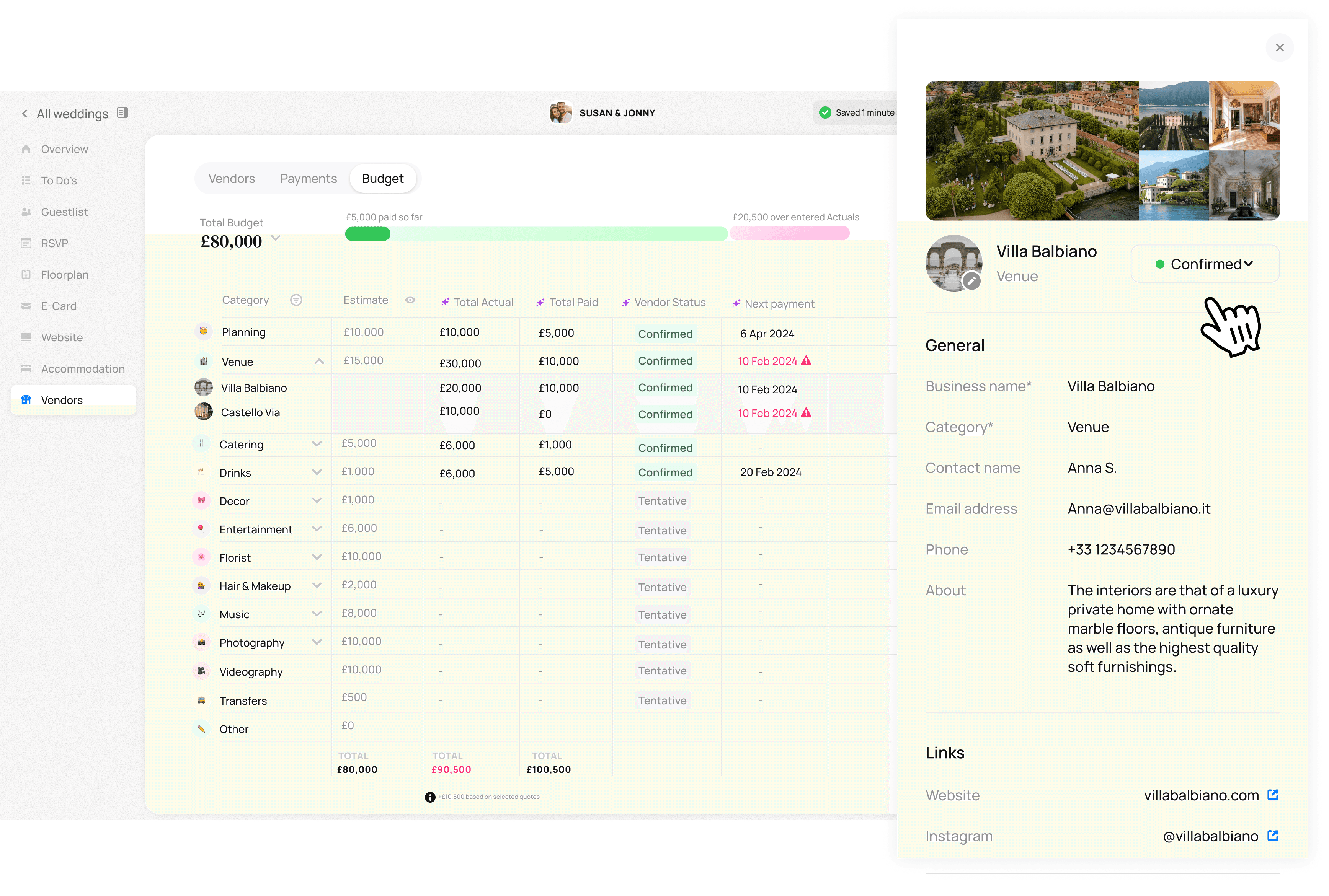 Monitor and manage all payments, quotes and contracts across vendors in one place. Our aim is to create a seamless and stress-free wedding budget management experience for your clients (and avoid all suprises!). Read the full Payments Tracking Guide here.