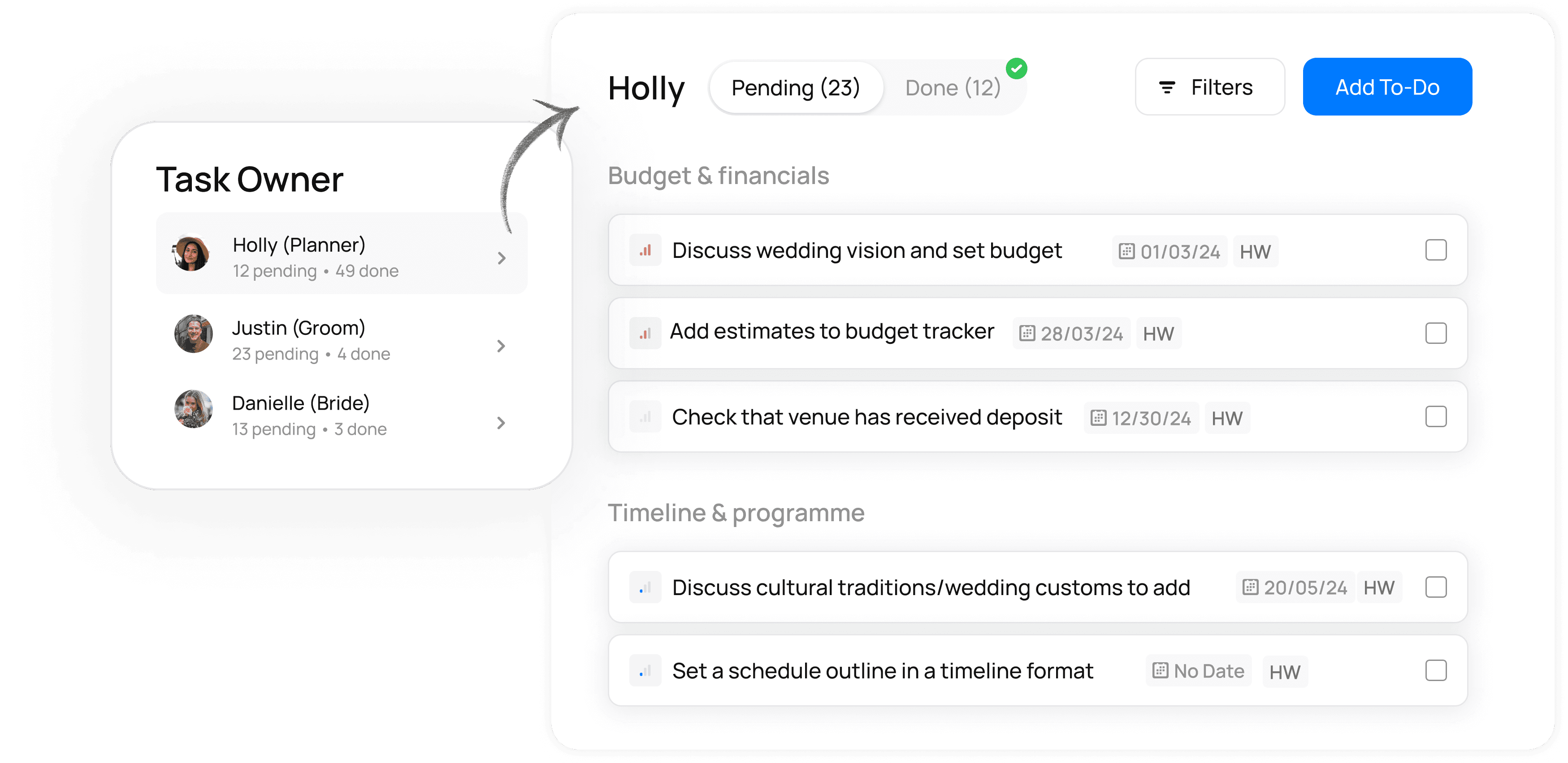 Collaborate with your couple on the most important tasks and keep progress on track. Set your own to-do's or quick add from our to-do library which has been curated by planners, just like you! Read the full To-Do Guide here.
