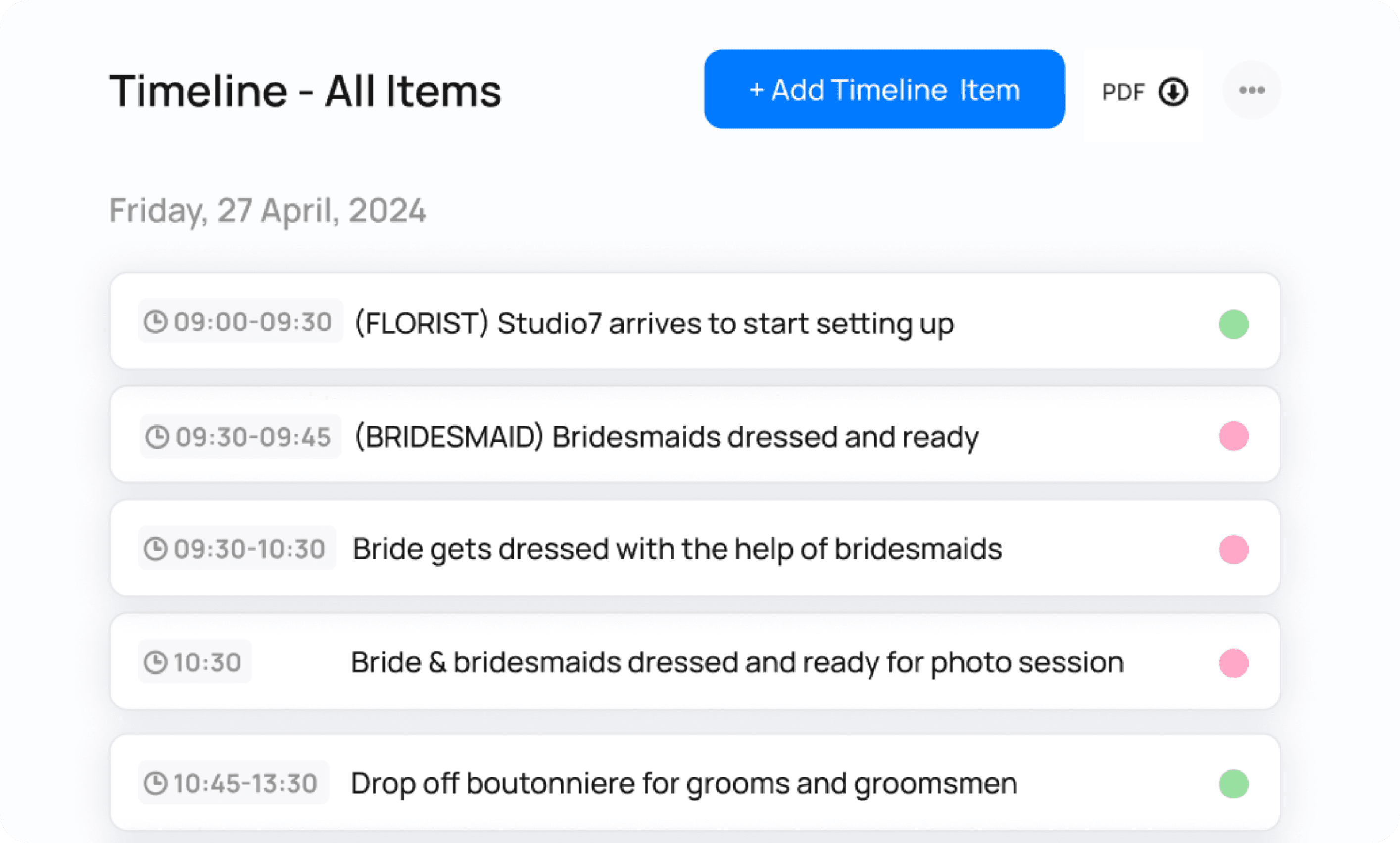 Create a timeline that outlines the run of the day (or days!) for the event. You can also export individual timelines for individual vendors. Each timeline is connected to the contact information of each vendor, for easy communication on the day. Read the full Timeline Guide here.