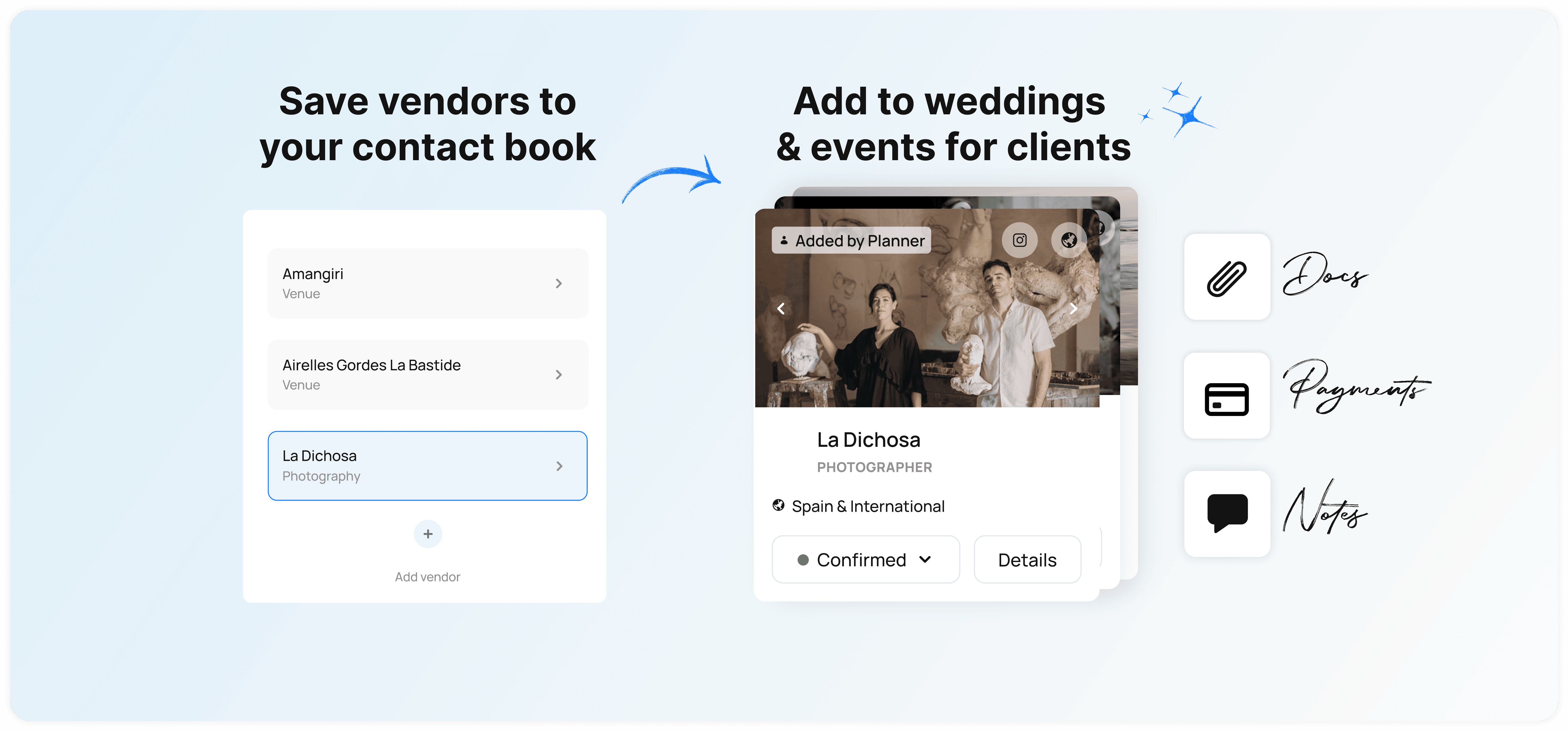 Create your little black book of venues and vendors you like to work with. Add them to weddings/events and transform your vendor selection process with your client. One source of truth for quotes, contracts, notes, payment information and more.