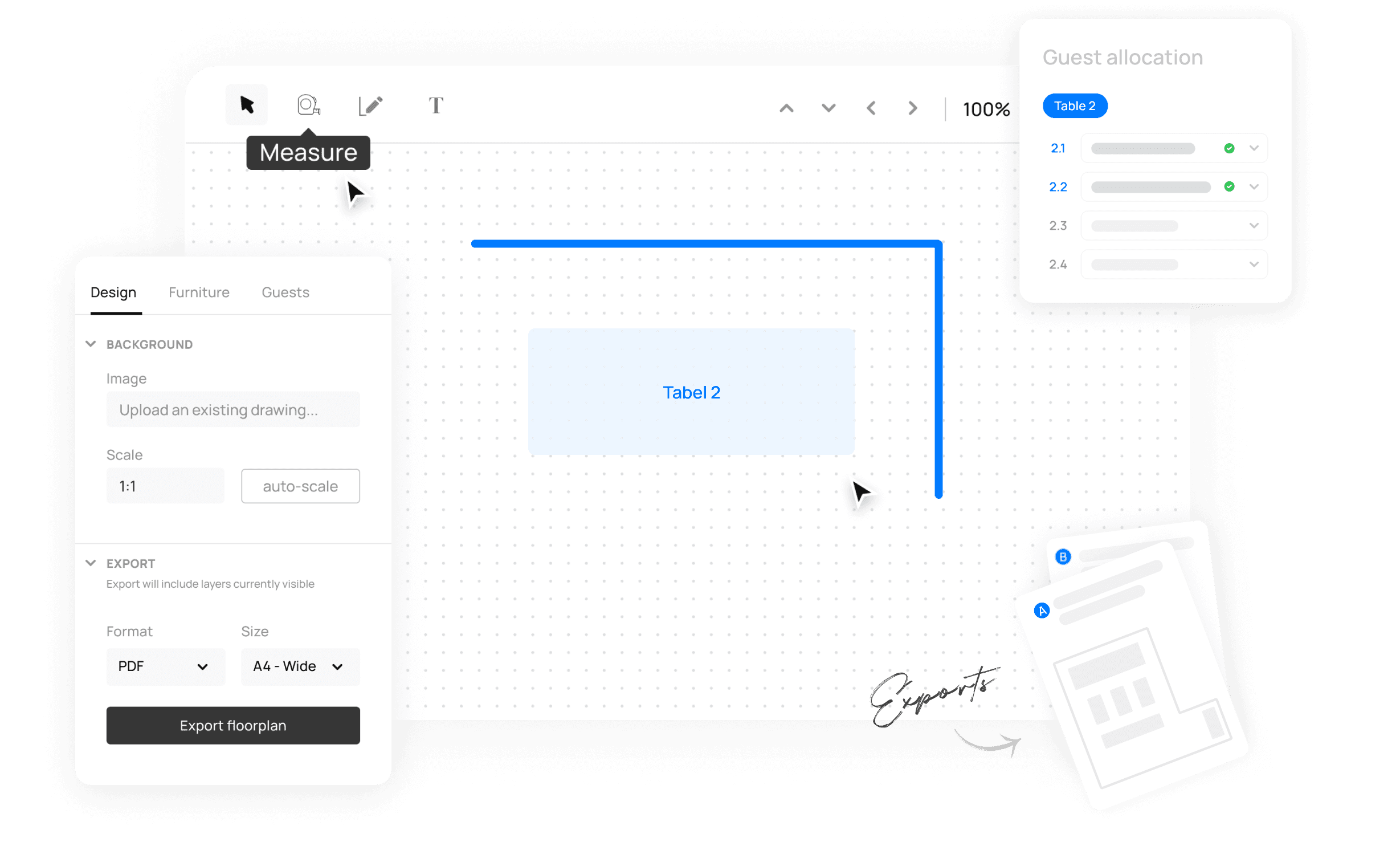 Design your floorplans from scratch or upload a blueprint and set it to scale! You'll be able to add furniture, drop guests into their seats and most importantly enjoy the automated PDF export which summarises all key information in one place. Read the full Floorplan & Seating Chart Guide here.