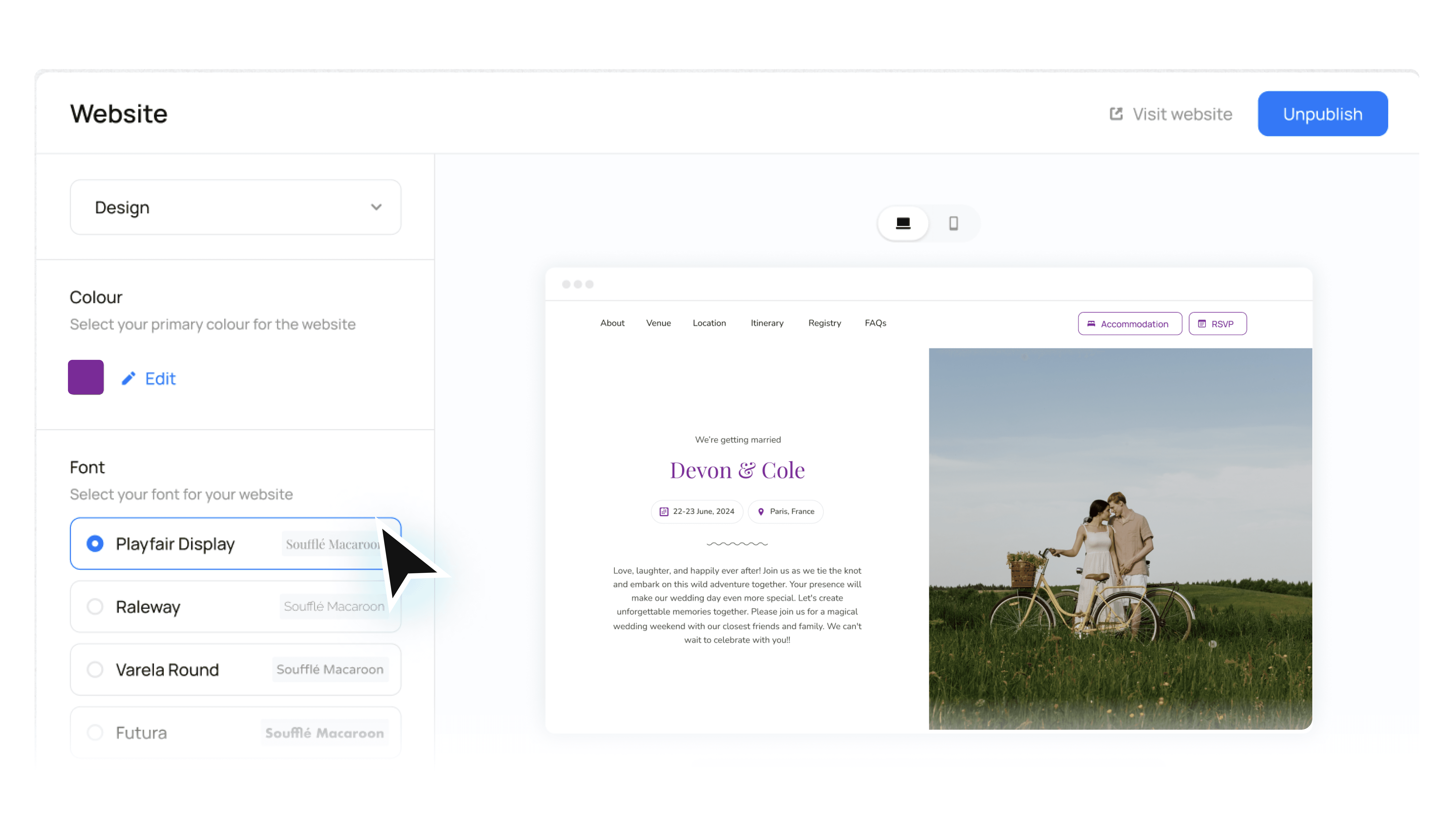 Create a stunning, personalized website effortlessly to showcasing your love story and event details. Most importantly, the RSVP allows you to track who is coming to each wedding event and their meal choices (which is connected to the floor & seat plan!). Connect to your accommodation page and any registry URL. Read the full Website Builder Guide here.