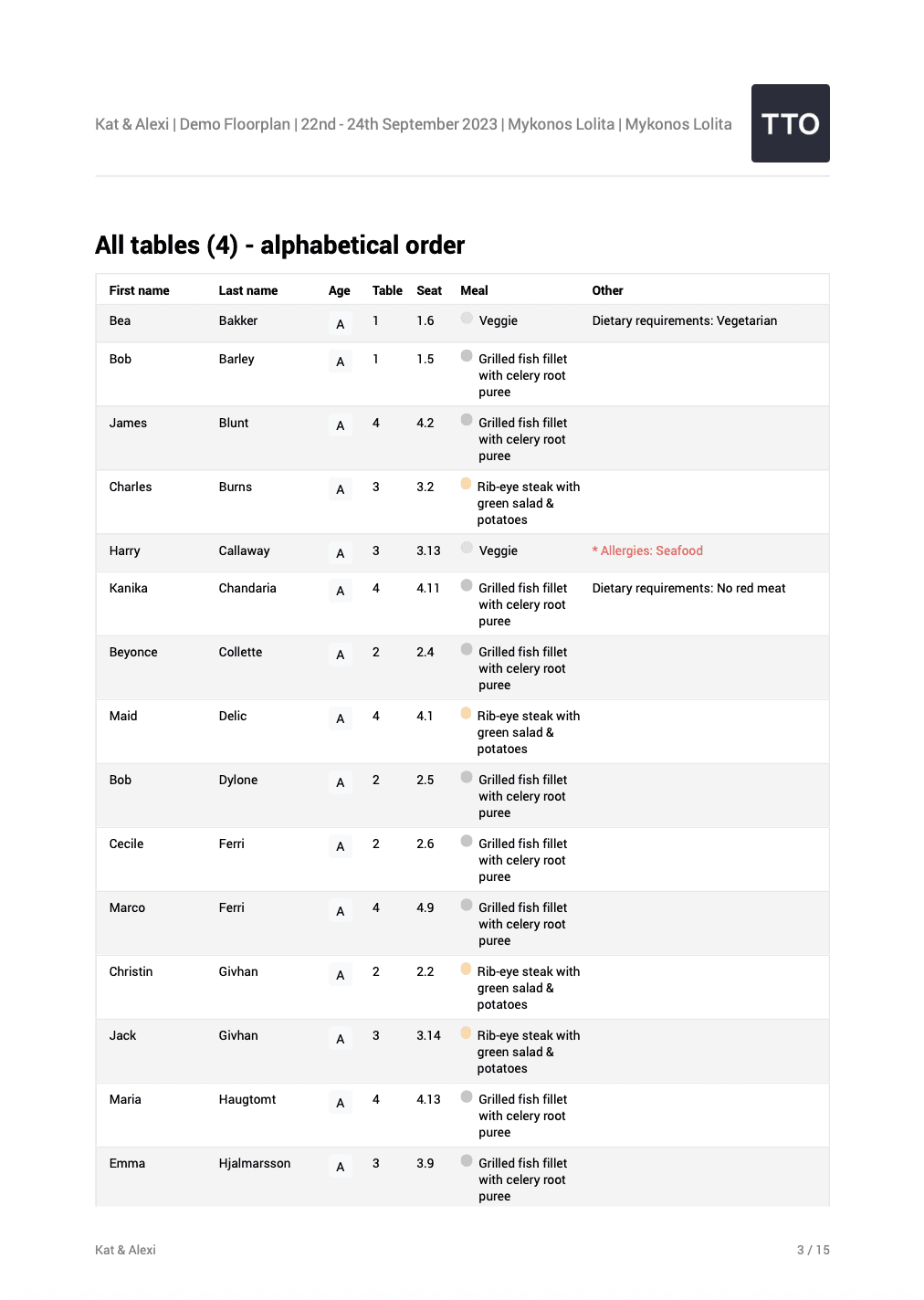 An overview of all guests in alphabetical order (useful for name cards, helping guests find their seats):