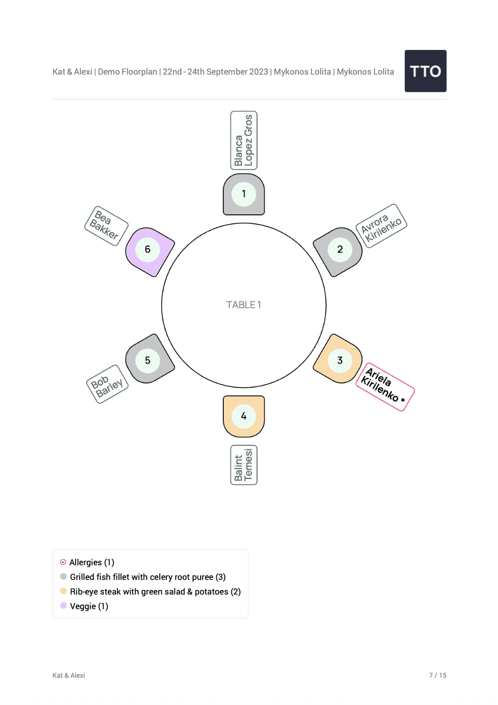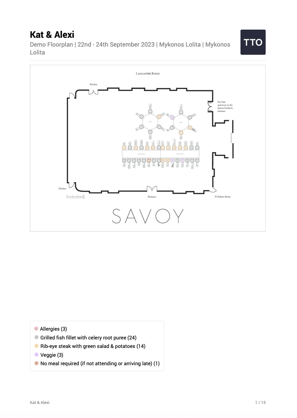 The first page is a summary of your entire floorplan, with seats color coded according to main meal selections: