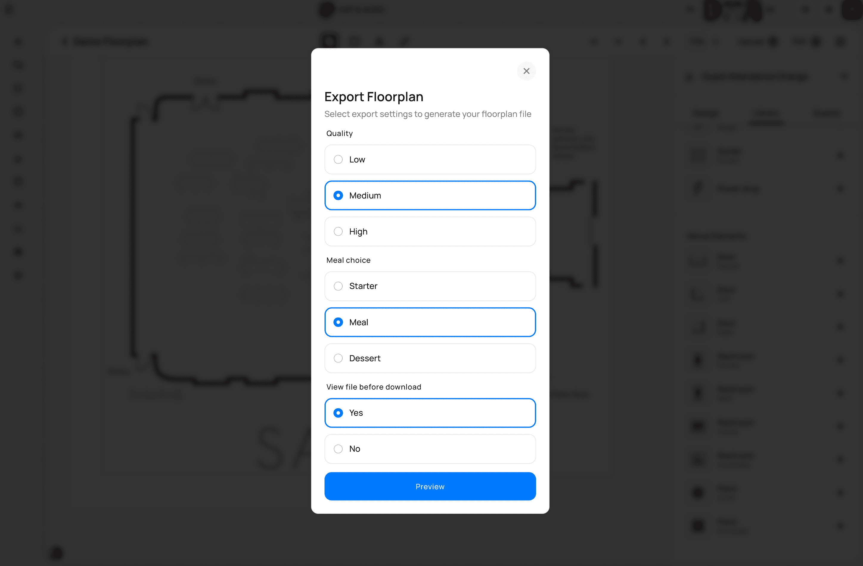 Download your design as a PDF in one click: press “PDF” in the toolbar to export your design. You will be able to select the quality, meal choice to sync with and whether you would like to see a preview before downloading. Allergy and dietary information is automatically synced and will be shown in all exports.
