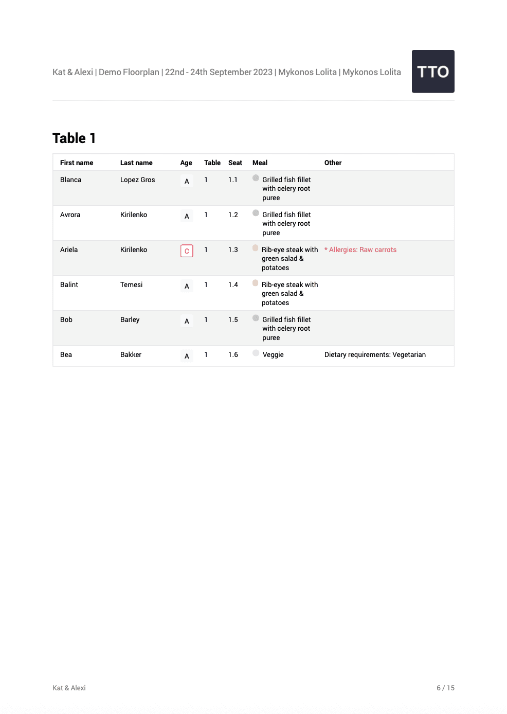 TTO: Generate polished, print-ready PDFs (complete with guest names, table numbers, and meal indicators) in a single click.