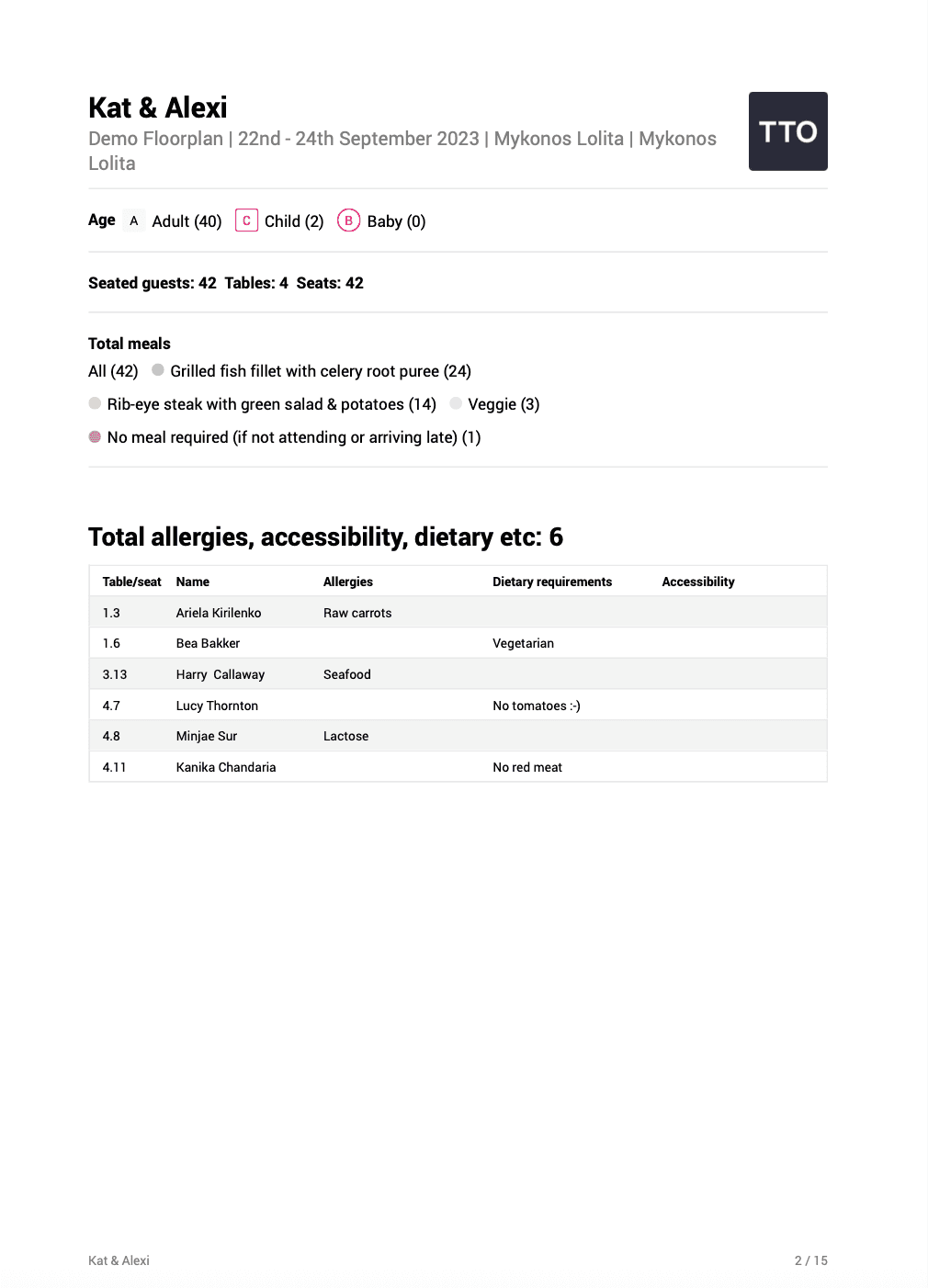 Export a clean PDF for caterers and suppliers to showcase seating arrangements, meal and dietary preferences