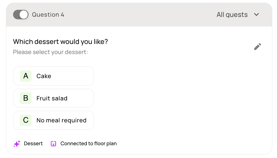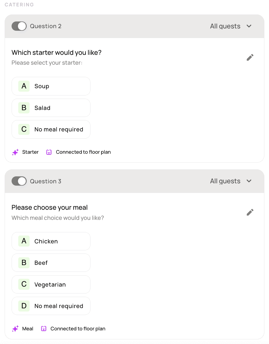 For example, collect starters, main meals & dessert selections (you can edit each question by clicking on the pencil icon):