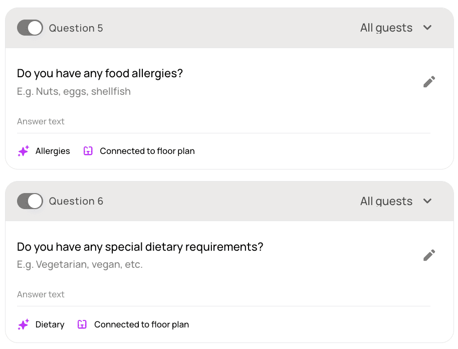 Each RSVP question is connected to a column in your guestlist table (indicated by the star sparkle icon). A purple star sparkly icon indicates that the question is currently visible. If it is grey, the question is not visible to guests. Each row shows the latest response from the guest but can be overwritten by any collaborator on the platform, so take care when editing guest information.