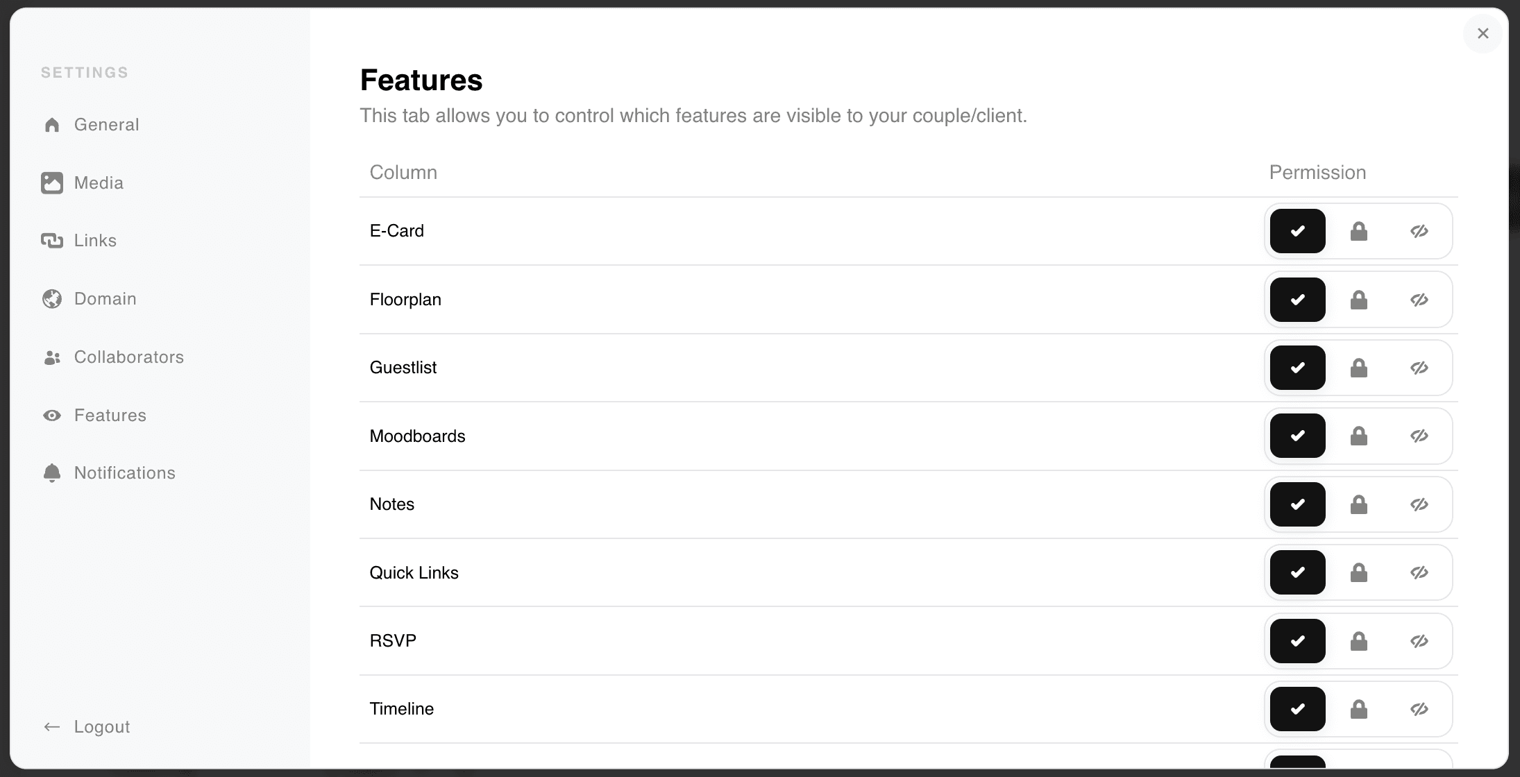 Manage which features are "Editable for Client," "View only for Client," or "Hidden from Client"