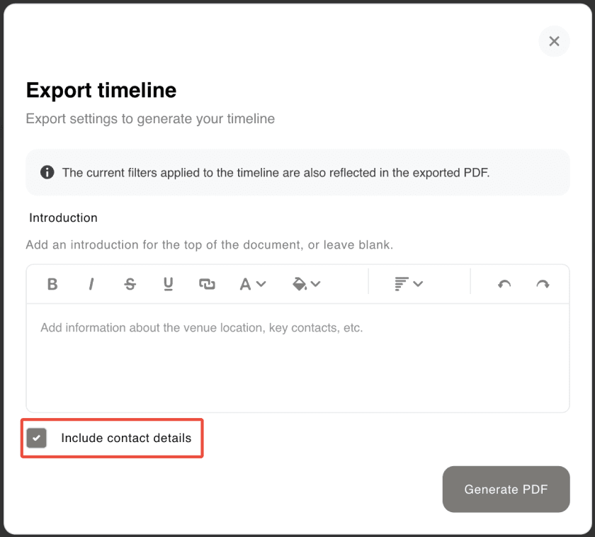 Create beautiful, detailed timelines that outline the run of the day (or days!) and export individual PDFs for each vendor.