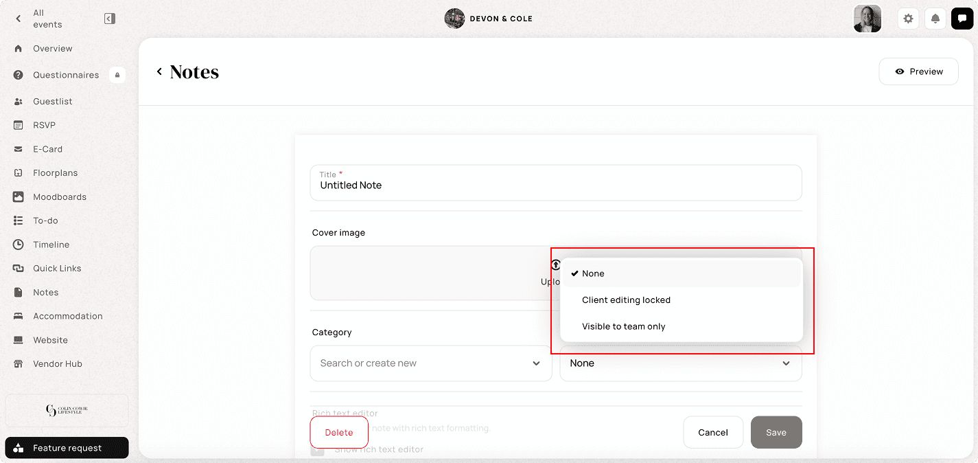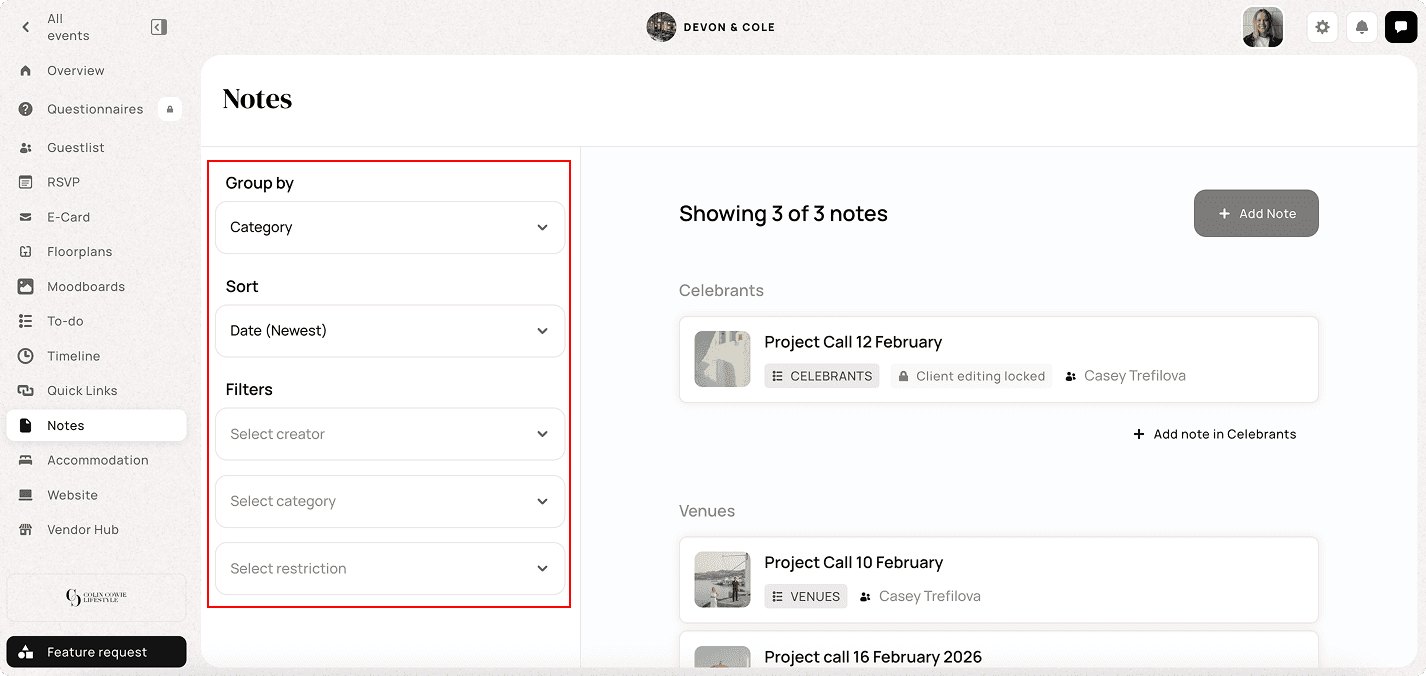 Notes are event-specific and live inside each individual wedding or event