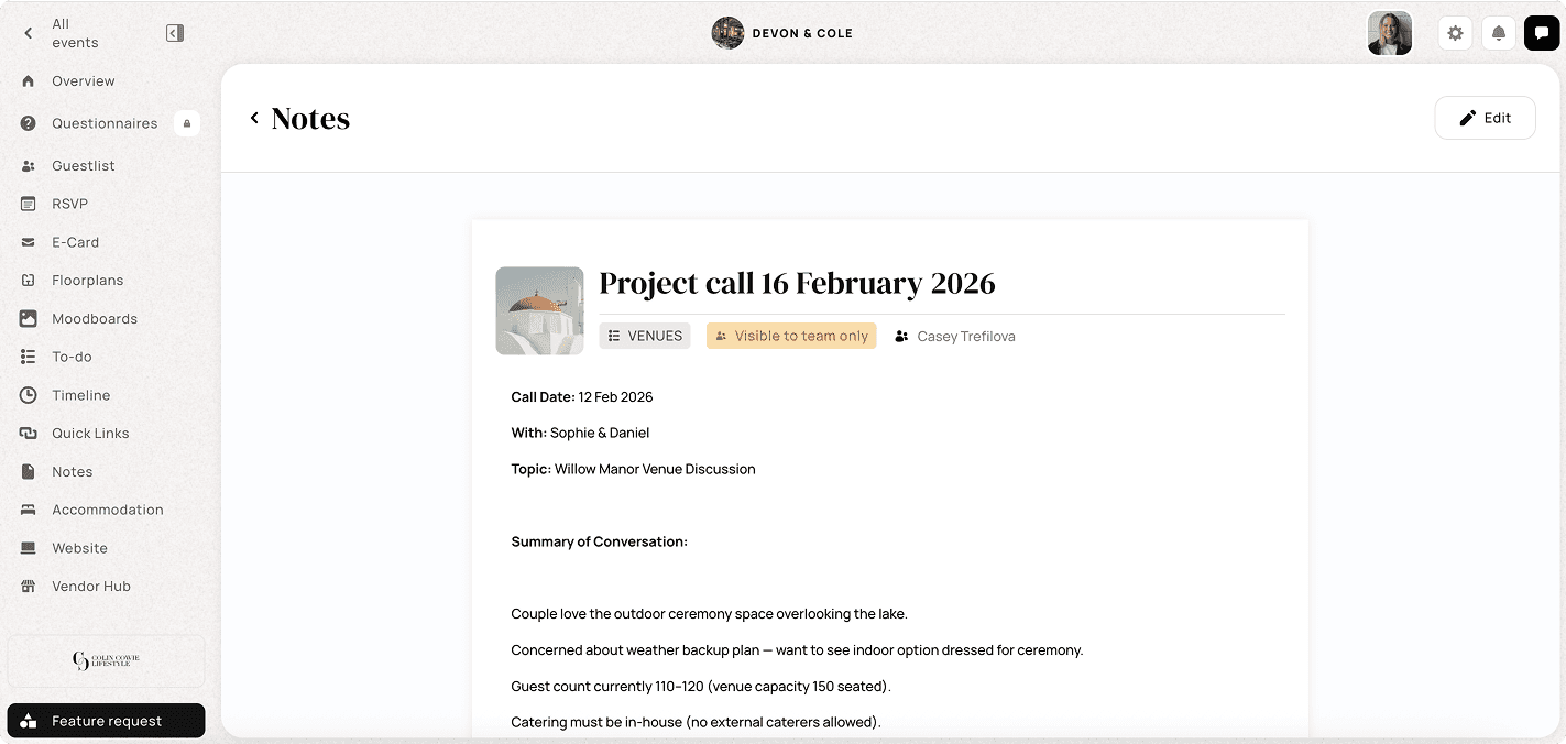 Every event has a million moving pieces, conversations with clients, internal decisions, vendor updates, location details… and keeping track of it all can quickly become overwhelming. That’s exactly why a dedicated notes feature in your planning workflow is a game changer.